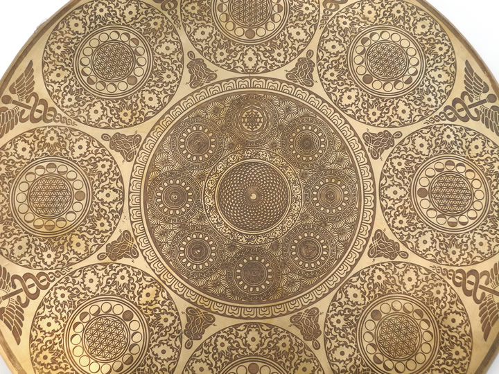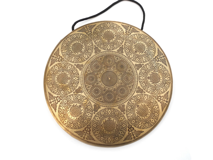 Sehr schöner Tibet Gong, aufwendig verziert mit der Blume des Lebens (8 x), tibetischen Schriftzeichen, Mantras und Ornamenten.