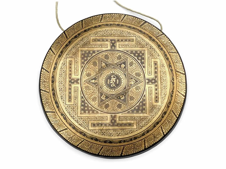 Wunderschöner, prunkvoll mit einem tibetischen Mantra und Ornamenten verzierter Gong. Diese Gongart ähnelt in ihrer Bauweise den chinesischen TamTam Gongs, d. h. der Rand ist