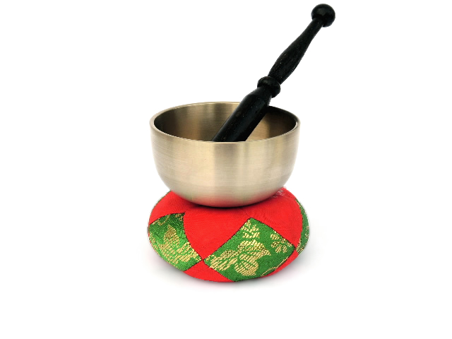 Die Klangschale wird mit einem Holzklöppel für einen hellen Klang und mit einem Gummischlägel (nicht abgebildet) für einen tieftonlastigen, weichen Klang geliefert.