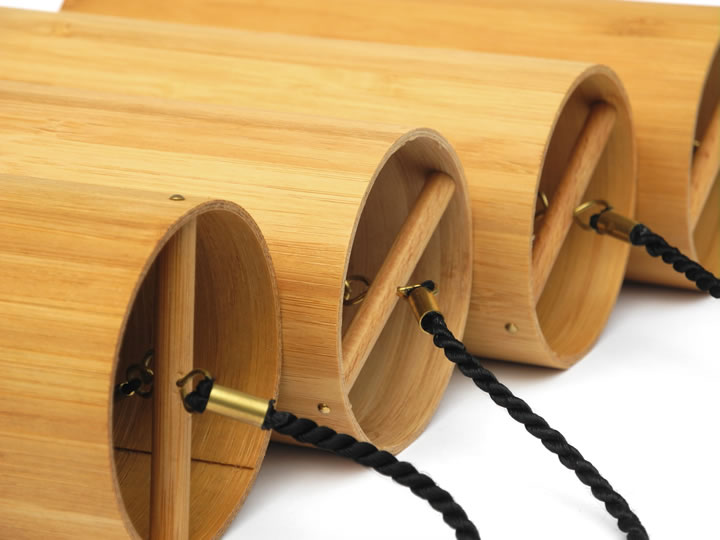 Durch genaue Stimmung entsteht ein obertonreiches Zusammenspiel von reinen Tönen. Der zylindrische Klangkörper aus Bambusfurnier gefertigt, verleiht dem Instrument einen tiefen, lang resonierenden sphärischen Nachklang.