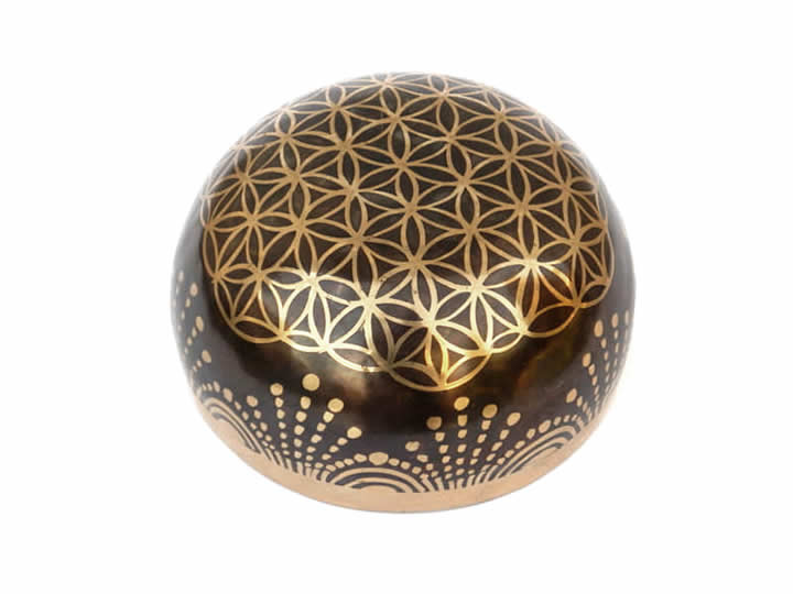 Ringsherum verziert mit Ornamenten, der Blume des Lebens und dem tibetischen Mantra "OM Mani Padme Hum". Im Innenboden ist der Buddha "weiße Tara"