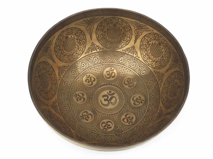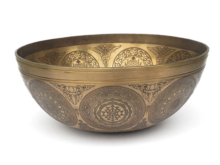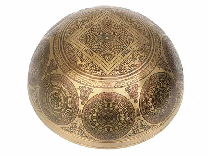Brillante Klangschale. Aufwendig verziert u. a. mit der Blume des Lebens (8 x), den sieben Chakren-Symbolen mit dem Digramm "Sri Yantra", dem OM-Zeichen (9 x) sowie vielen Ornamenten und Mantras.