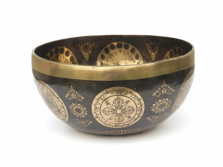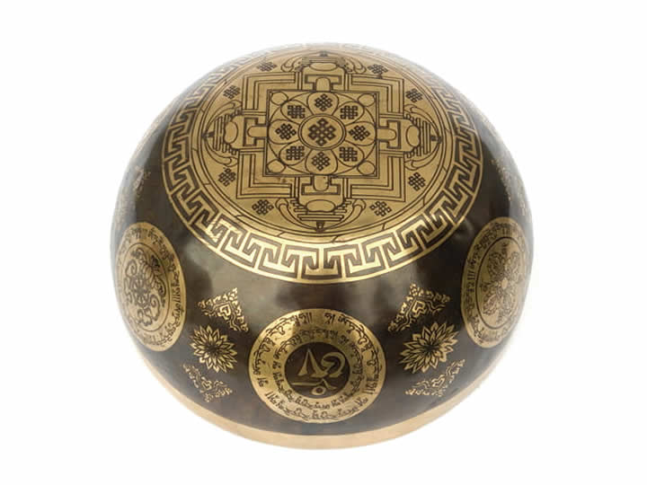 Sehr schön verziert u.a. mit dem Rad es Lebens, dem Doppeldorje (Symbol für das Unzerstörbare), den Mondphasen, der offenen Lotusblüte mit Feng-Shui Symbol, sowie verschiedenen tibetischen Schriftzeichen, Ornamenten und Mantras. Im Innenboden ist der Buddha "Grüne Tara"