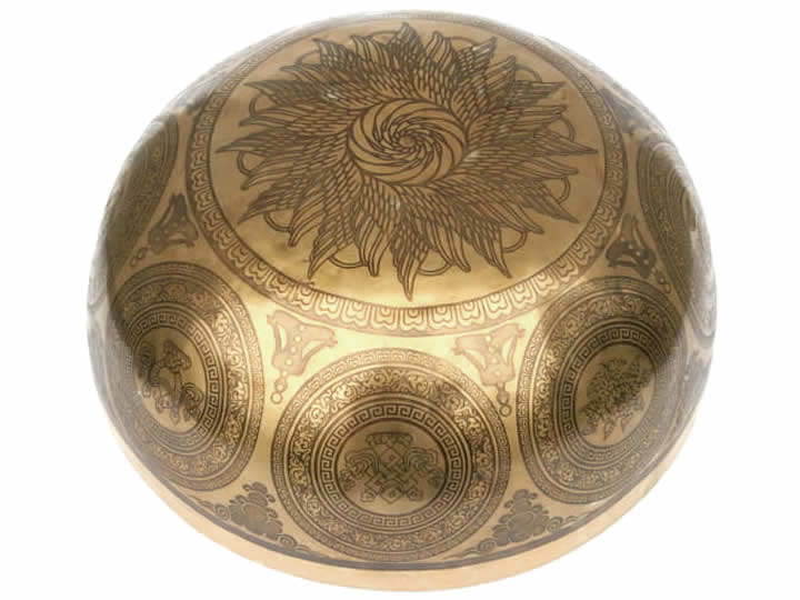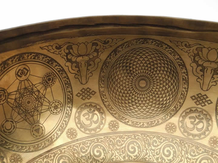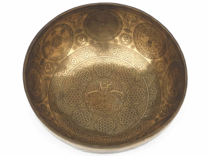 Bezaubernd schöne Klangschale. Neben vielen Ornamenten und Mantras ringsherum verziert mit den acht tibetischen Glückssymbolen, der Blume des Lebens, dem Baum des Lebens, dem OM-Zeichen, dem Endlosknoten u. a..