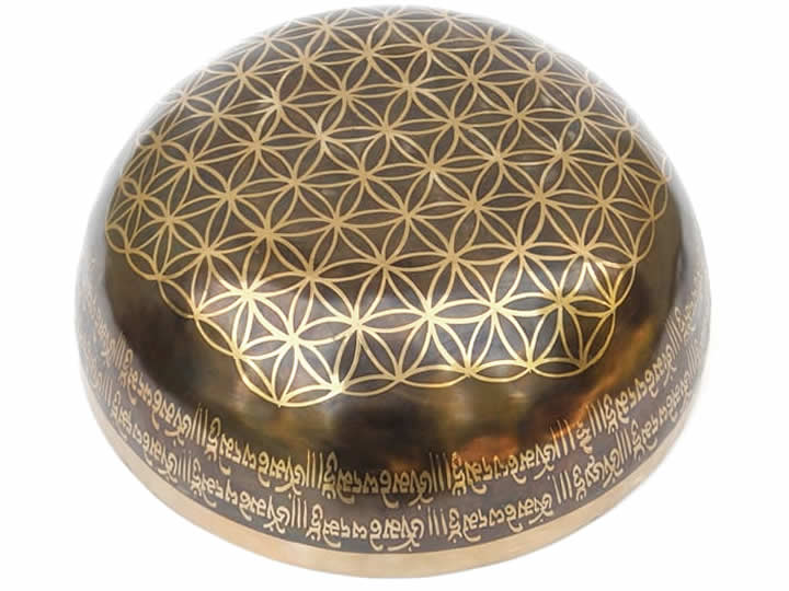 Sehr schöne Klangschale, ringsherum verziert mit dem tibetischen Mantra "Om Mani Padme Hum" sowie der Blume