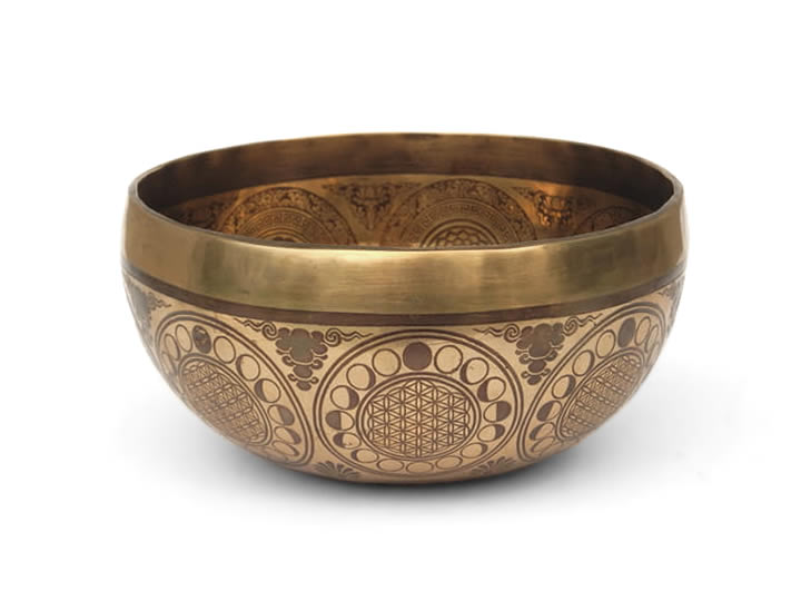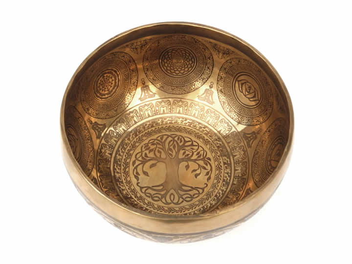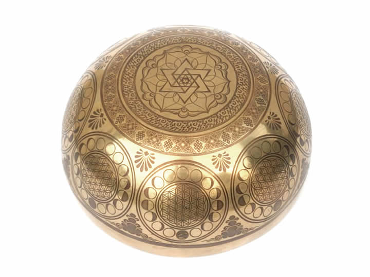 Aufwendig verzierte Klangschale. (Blume des Lebens, OM-Symbol, Symbole der sieben Chakren, Baum des Lebens, Diagramm "Sri Yantra", Meditationsbuddha, Ornamente u. a.)