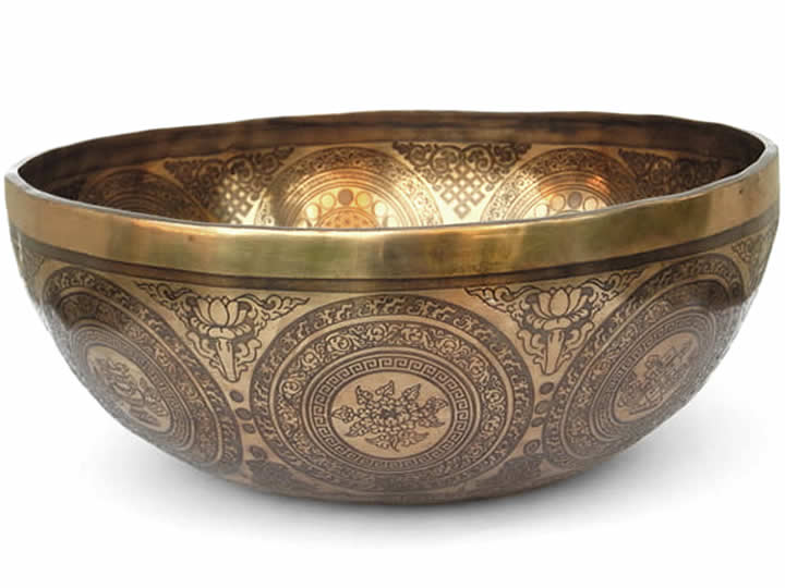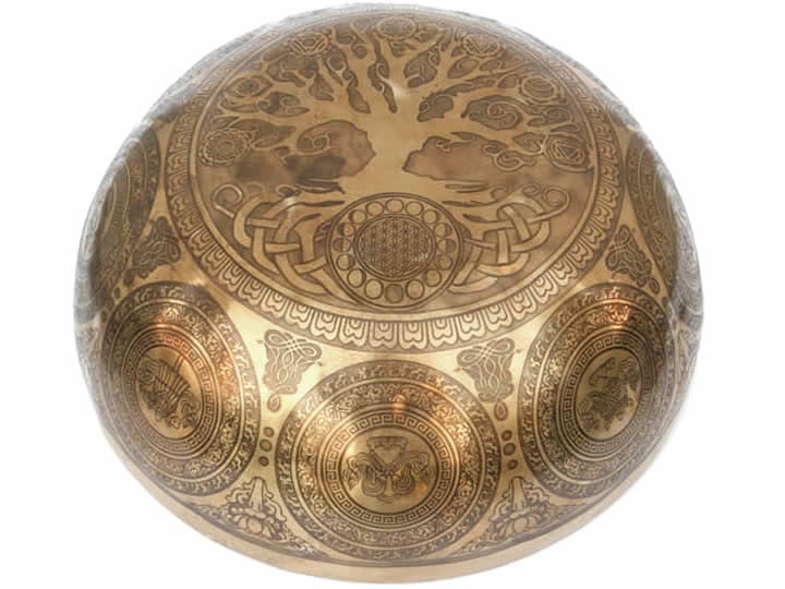 Sehr schöne, reich verzierte Klangschale. (tibetische Glückssymbole, Mantras, Ornamente, Blume des Lebens, Mondphasen, Chakren-Yogi mit den sieben Chakren-Symbolen, u. a.)