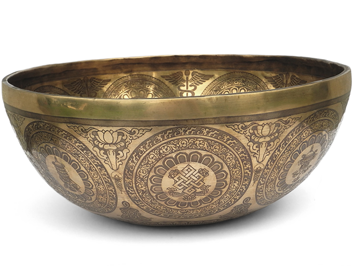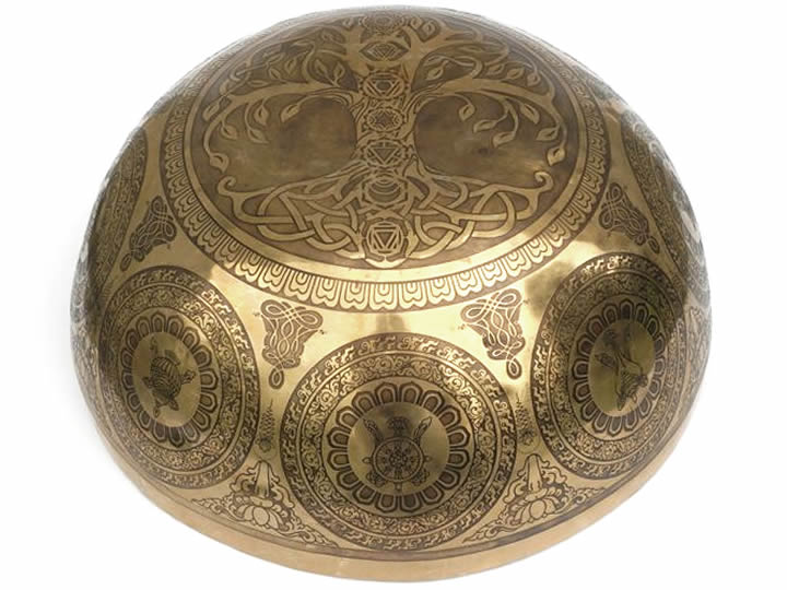 Wunderschön verziert mit den acht tibetischen Glückssymbolen, den sieben Chakren-Symbolen einem Mantra, dem Baum des Lebens, der Blume des Lebens, dem Diagramm "Sri Yantra" sowie diversen Ornamenten