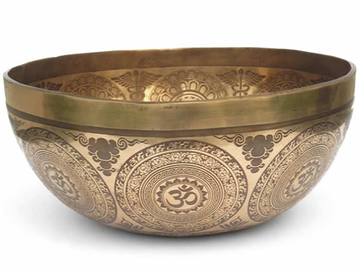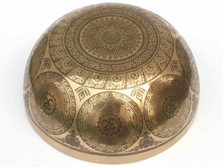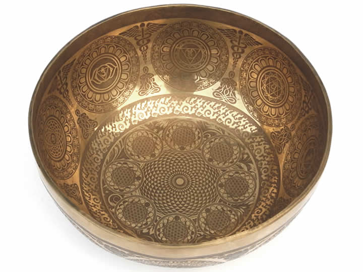 Exquisite Klangschale, aufwendig verziert u. a. mit der Blume des Lebens, den sieben Chakren-Symbolen, dem OM-Symbol Symbol sowie vielen Mantras und Ornamenten
