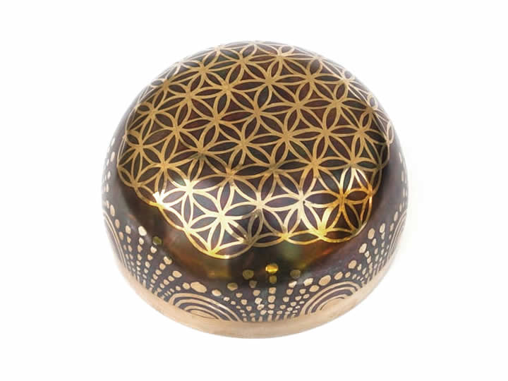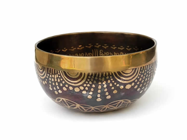 Sehr schöne Klangschale, ringsherum verziert mit dem tibetischen Mantra "Om Mani Padme Hum" sowie der Blume des Lebens. Im Innenboden ist der Buddha "Shakyamuni" eingraviert.
