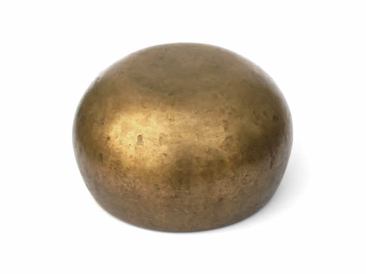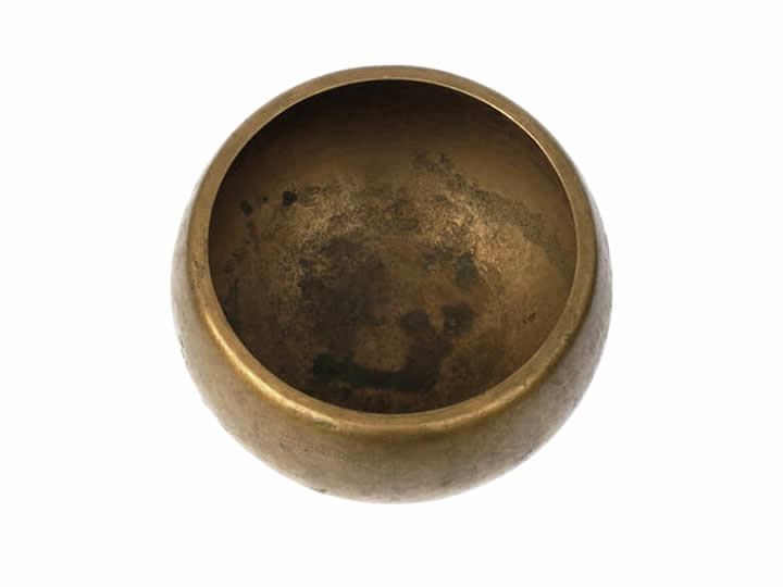 Schöne, anmutende, alte Klangschale. Ihre bauchige Form erzeugt einen stehenden, auf den Punkt konzentrierten, glockenartig runden und sehr durchdringlichen Klang.
